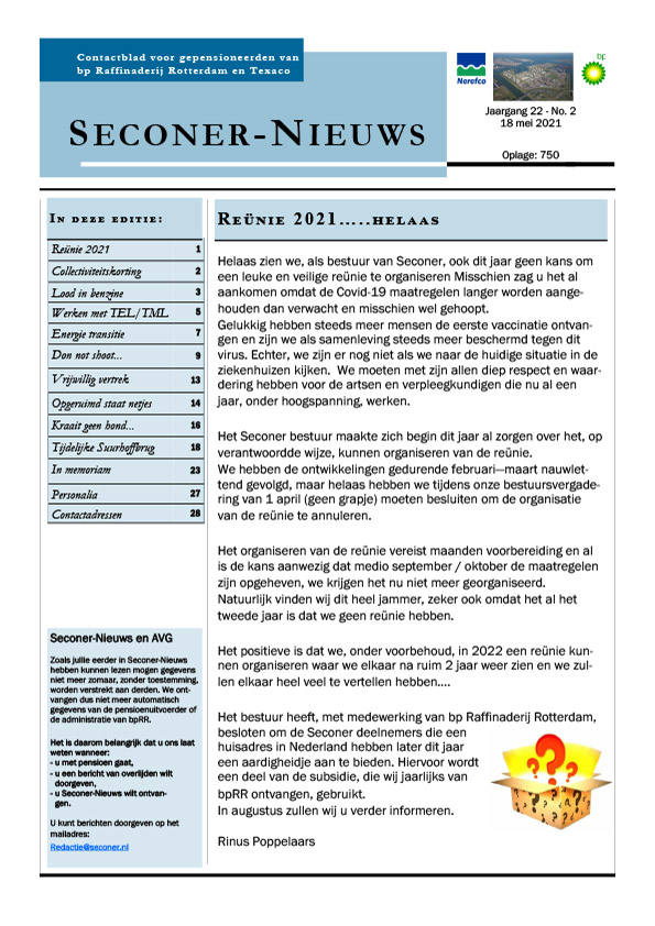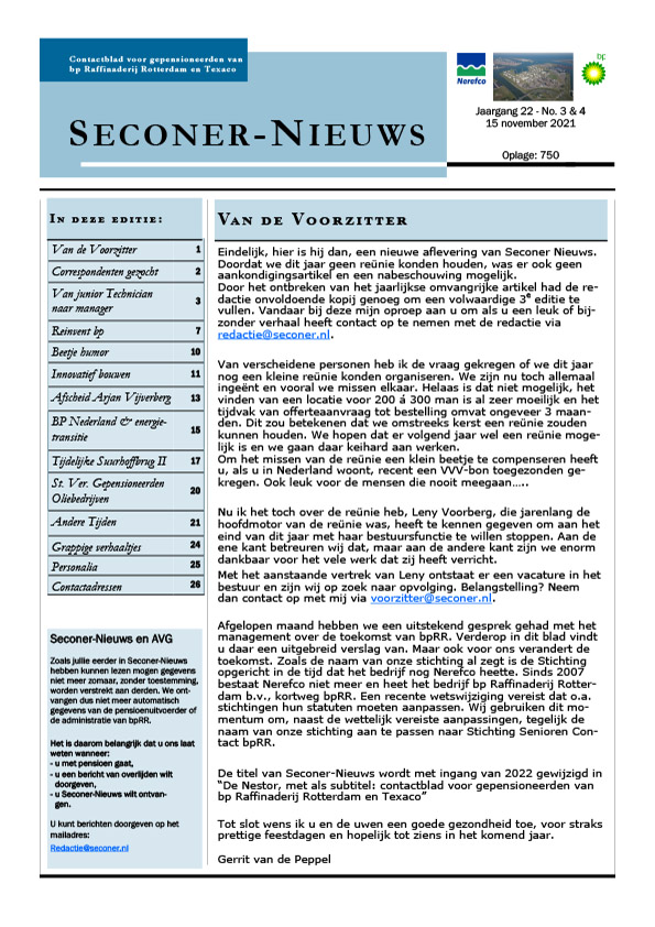 Het bestuur van Seconer heeft besloten om met het contactblad De Nestor te stoppen. Dit was zeker geen gemakkelijk besluit en we realiseren ons dat we met dit besluit een einde maakten aan het 25-jarig bestaan van het contactblad Seconer-Nieuws / De Nestor. Het besluit is niet uit luxe genomen, maar het verkrijgen van kopij, het samenstellen en gereedmaken voor verzending verliep ging steeds meer op werk lijken. Ook ontvingen we steeds meer exemplaren retour van PostNL omdat het adres niet correct was.